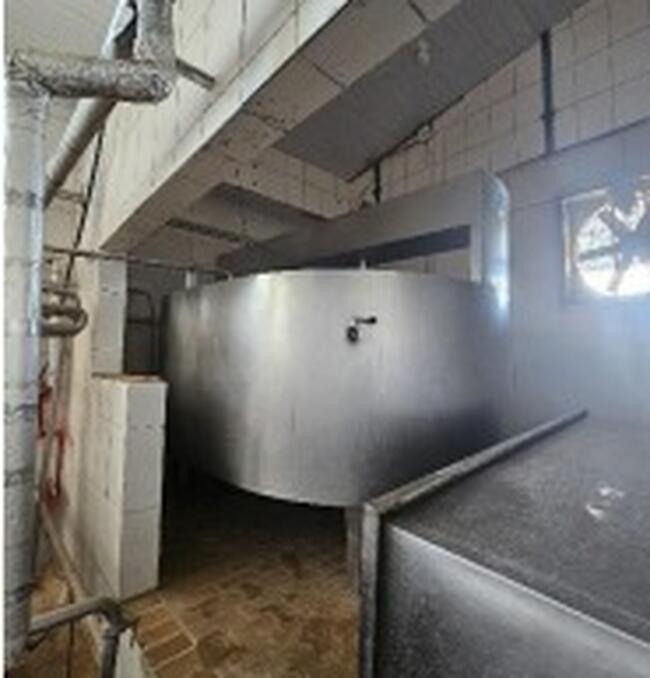 Observação: 8) Queijomatic industrial em aço inox, marca MAS, modelo QJT-6000 KG, nº de série QJT 000004, ano de fabricação 2009, com agitador central e estrutura de suporte fixa em alvenaria. Capacidade estimada para produção de até 6.000 litros por ciclo. Observa-se a necessidade de higienização do interior do tanque