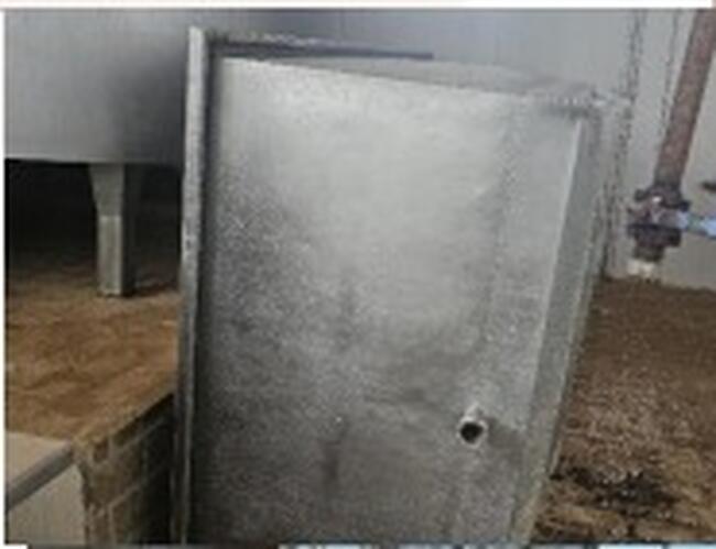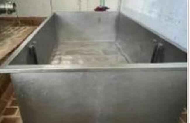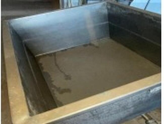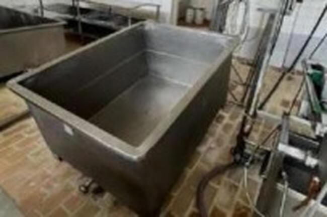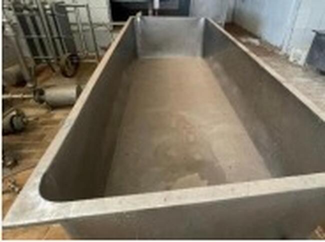Observação: 9) Três tanques em aço inox de formatos e dimensões variadas, com drenos inferiores. Sem marca ou capacidade nominal visível. Observa-se necessidade de higienização;