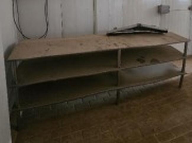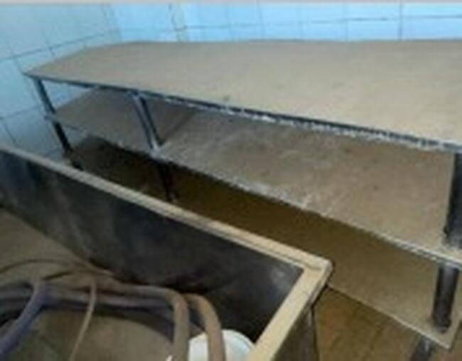 Observação: 14) Mesa em aço inox com tampo inclinado e duas prateleiras inferiores inclinados. Estado usado, com acúmulo de poeira e marcas de uso contínuo;