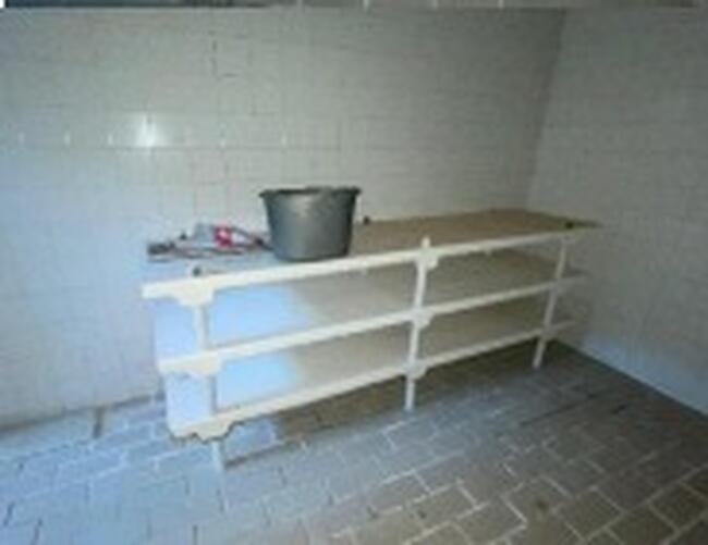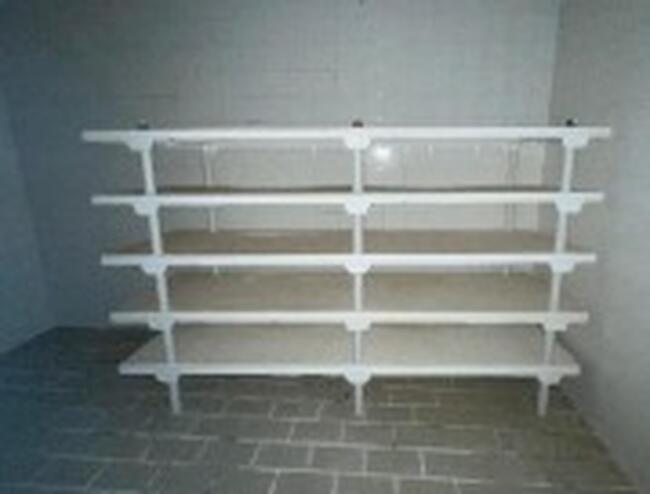 Observação: 23) Prateleiras modulares para queijos, com estrutura de fibra de vidro. Uma unidade com 3 andares e outra com 5 andares. Utilizadas para maturação ou armazenamento em ambiente refrigerado. Apresentam sinais de uso. Estado: regular