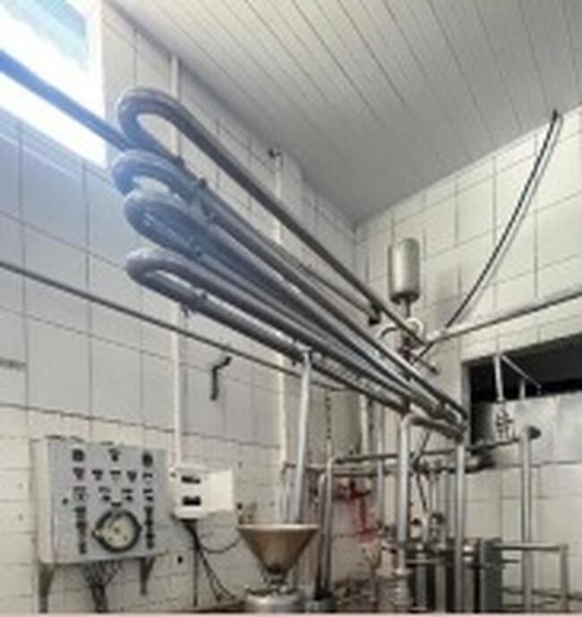 Observação: 28) Sistema de pasteurização industrial, com tubulações em aço inox, trocador de calor e componentes fixados à estrutura. Sem especificações visíveis, em estado regular e sem teste de funcionamento;