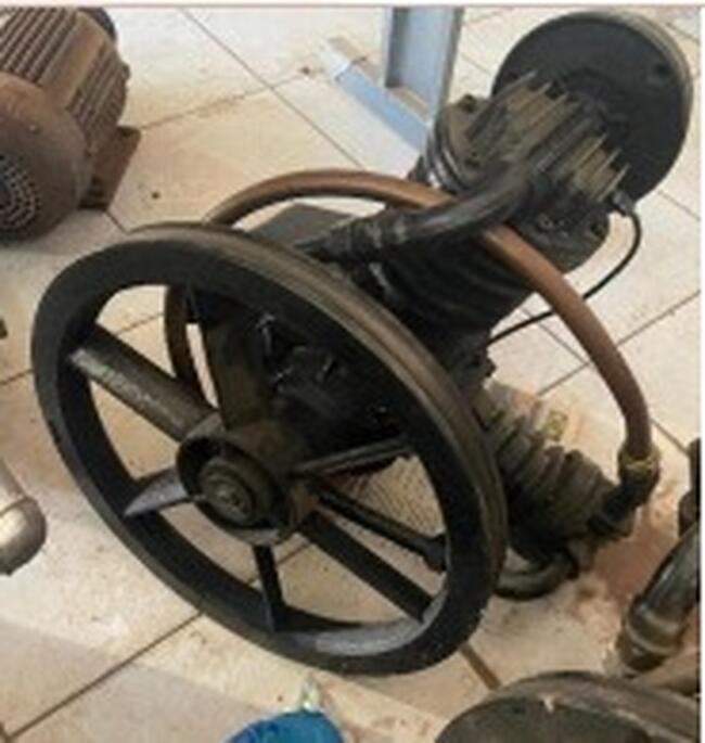 Observação: 29) 2 Cabeçotes de compressor de ar tipo pistão, com polia acionada por correia, capacidade estimada de 10 PCM / 140 PSI. Uma unidade em bom estado e outra visivelmente desgastada;