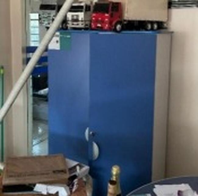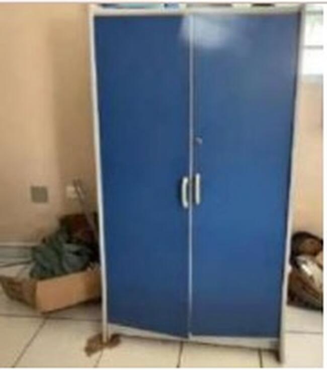 Observação: 31) 2 Armários verticais de madeira MDF, com duas portas e quatro prateleiras internas, acabamento azul com estrutura cinza. Estilo padrão de escritório, estado regular;