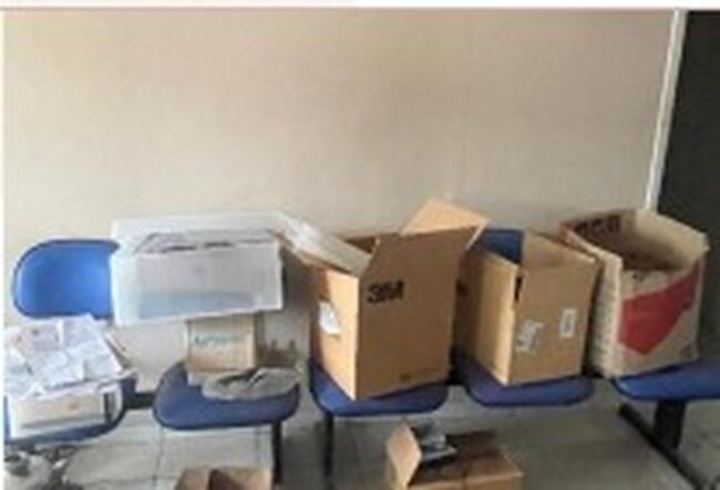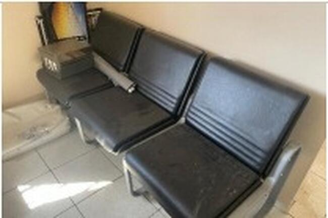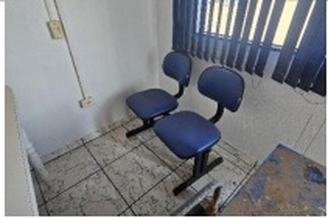 Observação: 32) Longarinas secretária com estrutura metálica e assento estofado, sendo: 2 unidades com 2 lugares (cor azul), 1 unidade com 3 lugares (cor azul) e 1 unidade com 3 lugares (cor preta). Estrutura em estado regular de conservação;