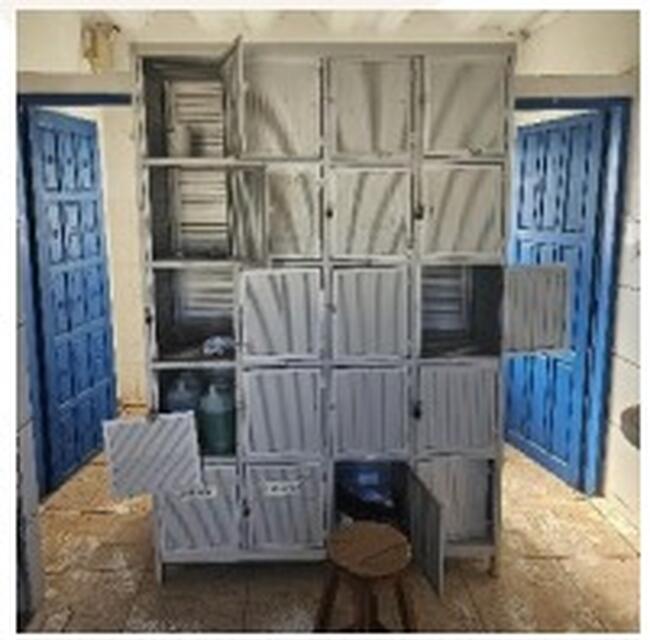 Observação: 36) Armário roupeiro metálico com 20 compartimentos do tipo guarda-volume. Estrutura em aço pintado, com portas basculantes independentes. Apresenta sinais de uso, como manchas, pontos de oxidação, portas desinstaladas e presença de cadeados em algumas unidades;