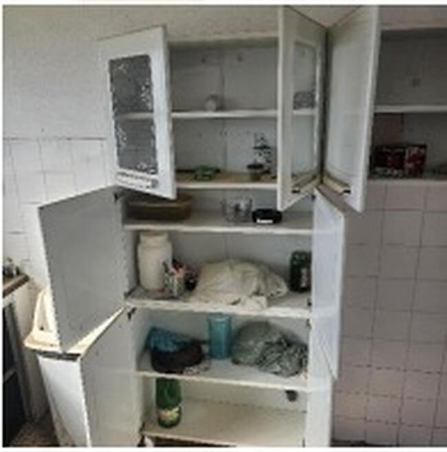 Observação: 37) Armário de cozinha em aço, 1 unidade. Armário branco, composto por duas colunas com portas inferiores e superiores, e quatro módulos suspensos. Fabricado em aço com pintura eletrostática, apresenta sinais típicos de uso, com partes desgastadas, pequenas oxidações e presença de portas com vidros. Conservação geral regular;