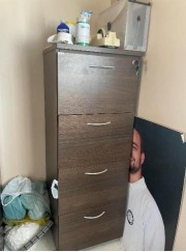 Observação: 40) Gaveteiro em MDF com quatro gavetas, na cor amadeirada escura, dotado de puxadores metálicos curvos e sistema de tranca com chave na gaveta superior. O móvel apresenta-se em bom estado geral, com leve acúmulo de sujeira externa, sem prejuízo à sua funcionalidade;