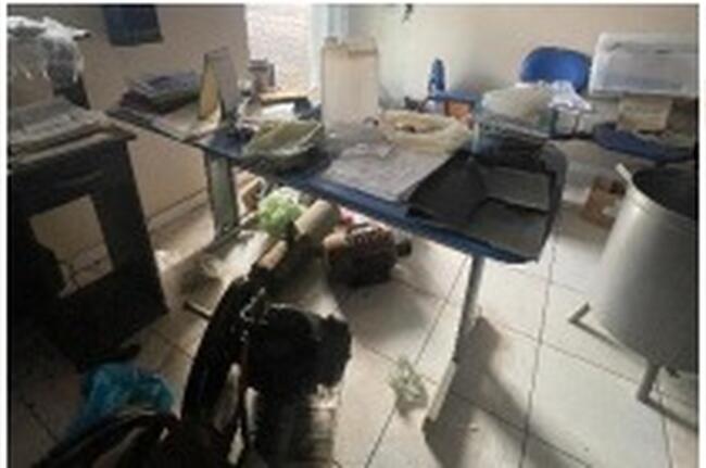 Observação: 42) Mesa de escritório retangular com tampo em MDF laminado azul e estrutura metálica tipo painel em cinza, com pés em “T” invertido. Aparenta bom estado estrutural, embora utilizada como apoio para diversos objetos, sem danos visíveis relevantes