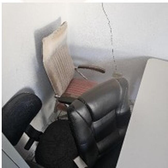 Observação: 43) 3 Cadeiras de escritório, sendo: (i) 1 giratória com base de cinco rodízios e estofamento em tecido preto, com sinais de uso e manchas; (ii) 1 fixa, estofada em tecido aveludado bege e rosa, com braços cromados, em estado de conservação ruim; e (iii) 1 giratória tipo presidente, com encosto alto e revestimento em courino preto, em estado de conservação bom;