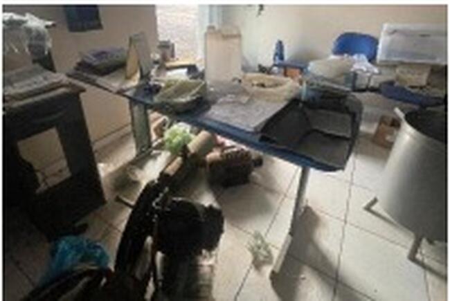 Observação: 44) Mesa de escritório retangular com tampo em MDF e estrutura metálica, na cor escura, com painel frontal vazado em metal. Apresenta sinais moderados de uso