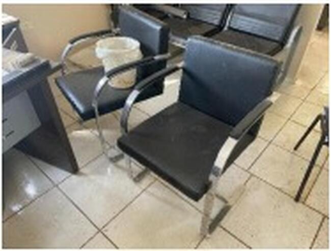 Observação: 46) 2 Cadeiras de escritório modelo BRNO, estrutura metálica cromada e revestimento em couro sintético preto. Ambas apresentam sinais superficiais de uso, mas mantêm funcionalidade;