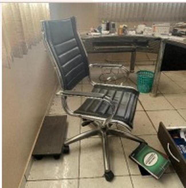 Observação: 49) Cadeira de escritório giratória tipo presidente, com base cromada, estrutura metálica e revestimento em couro sintético preto, em bom estado de conservação;