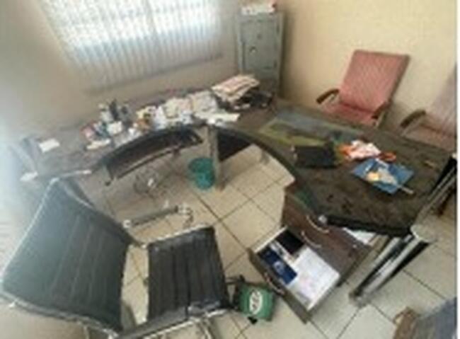 Observação: 50) Mesa de escritório grande em L, com tampo de vidro fumê e estrutura metálica com suporte lateral em MDF com gavetas; apresenta sinais de uso, marcas de poeira e leve desgaste superficial, mas permanece funcional;