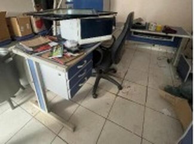 Observação: 51) Mesa de escritório em L, com tampo de fórmica azul e estrutura metálica branca, dotada de três gavetas embutidas e tampo lateral de apoio. Apresenta desgastes visíveis na superfície e nas extremidades, além de pontos de oxidação na base metálica;