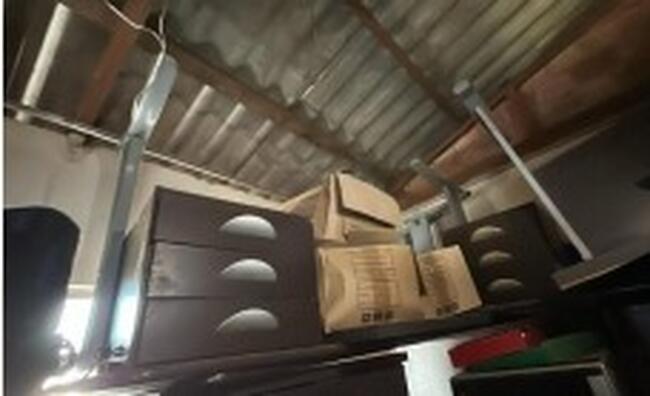 Observação: 52) 5 mesas de escritório convencionais, com estrutura metálica em “L” invertido e tampo de fórmica cinza, sobrepostas e armazenadas em ambiente fechado. O estado de conservação é incompatível com uso imediato, apresentando acúmulo de poeira, armazenamento inadequado e indícios de desgaste por tempo e uso;