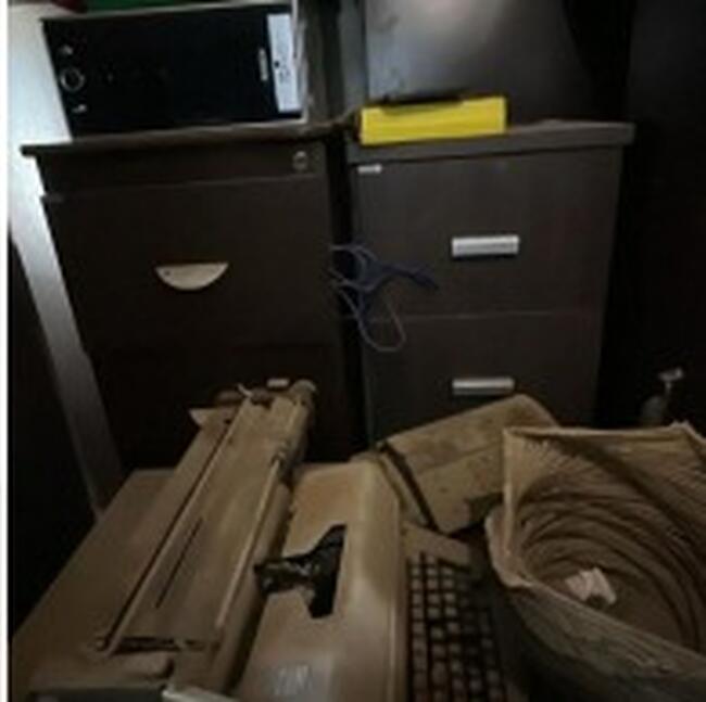 Observação: 53) 2 gaveteiros de escritório em MDF, cor escura, com 2 ou 3 gavetas, ambos com puxadores metálicos. As peças apresentam sinais de desgaste, acúmulo de poeira e possível avaria no acabamento