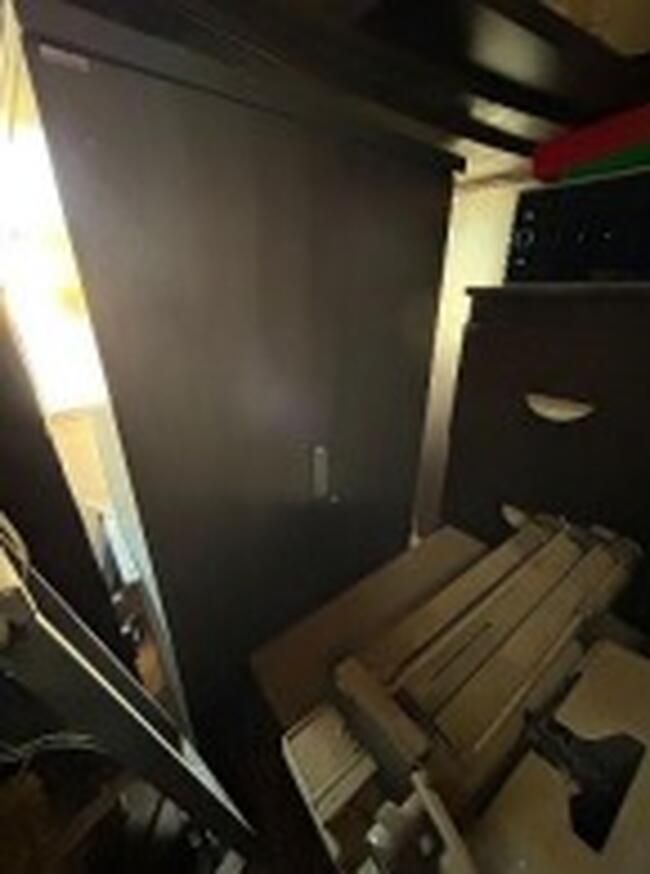 Observação: 54) 5 Armários de escritórios em MDF escuro, com duas portas verticais e puxadores metálicos, aparenta ser do tipo alto com prateleiras internas. O item apresenta sinais de desgaste compatíveis com uso contínuo e armazenamento prolongado em ambiente com acúmulo de poeira;