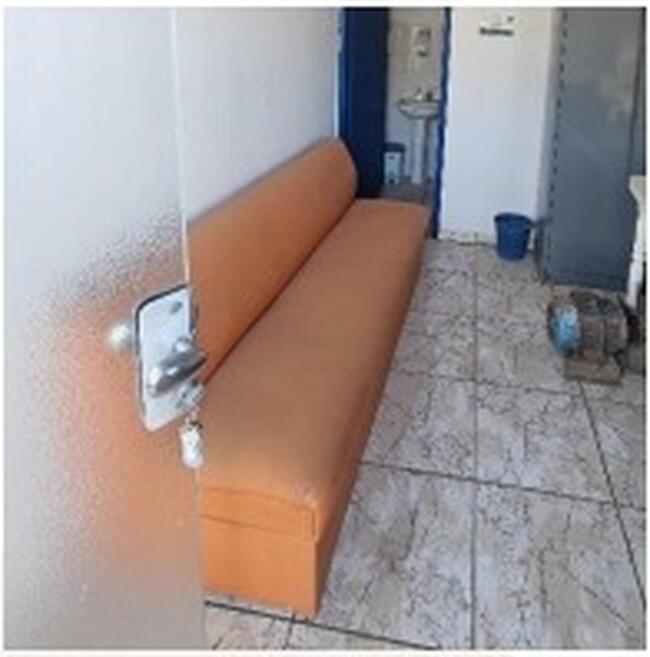 Observação: 55) Sofá longo estofado, sem braços, revestido em tecido alaranjado. A peça apresenta design simples, com encosto fixo e estrutura embutida, aparentando uso moderado e sinais de desgaste compatíveis com o tempo de utilização