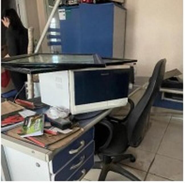 Observação: 57) Micro-ondas Panasonic, modelo antigo com painel digital, em estrutura branca com detalhes em azul. Apresenta sinais visíveis de uso, mas encontra-se aparentemente íntegro, sem danos estruturais aparentes. Não foi possível testar seu funcionamento;