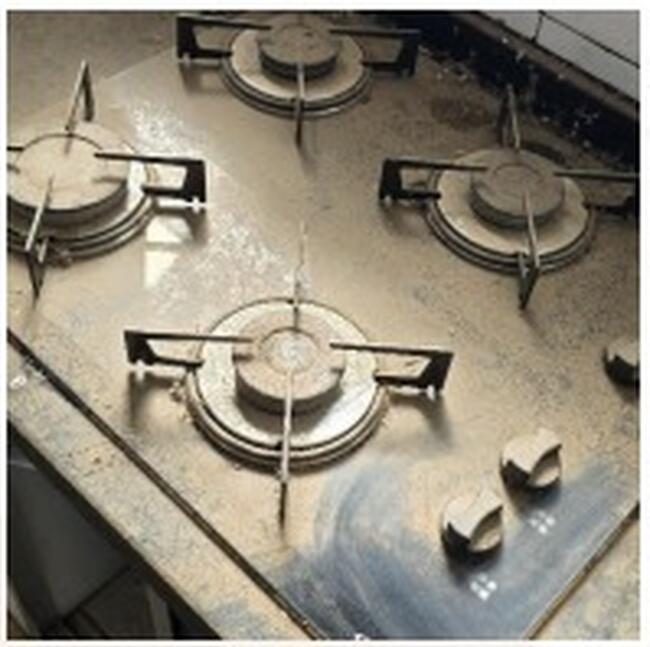 Observação: 58) Cooktop 4 bocas Fischer, embutido em tampo de bancada. Apresenta acúmulo excessivo de poeira e sinais de desgaste por tempo de uso, sem testes de funcionamento. Estrutura de vidro com quatro botões de controle;