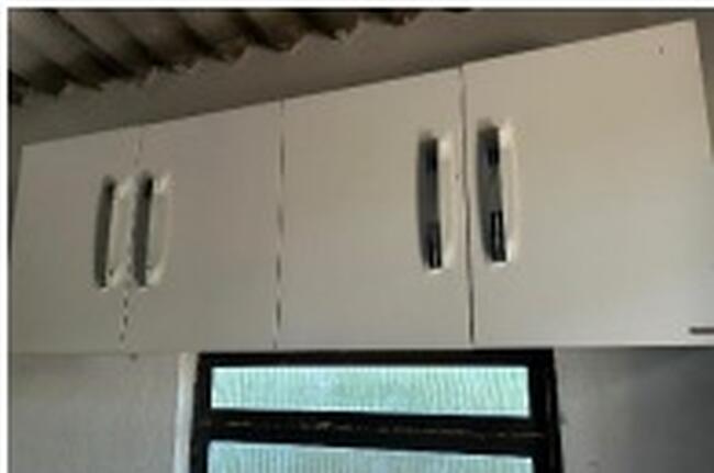 Observação: 61) Armário aéreo de parede com quatro portas, acabamento branco, puxadores metálicos verticais e estrutura em MDF, marca Kappesberg. Fixado em ambiente de apoio, apresenta sinais moderados de uso;