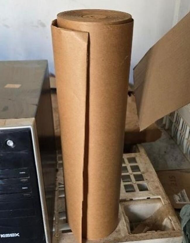 Observação: 71) Rolo de papel kraft (papel pardo) em folha contínua, utilizado para embalagem e proteção de produtos. Apresenta-se em estado visualmente regular, sem dados sobre metragem, gramatura ou marca. Há indícios de armazenamento prolongado;