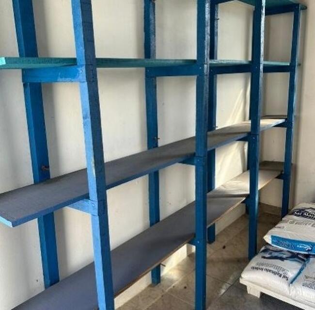 Observação: 78) Estante de madeira artesanal com cinco prateleiras, pintada na cor azul, estrutura simples e montagem manual. Utilizada para organização de materiais diversos. Apresenta estado razoável de conservação, com sinais de uso;