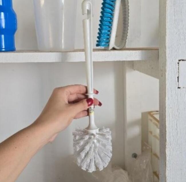 Observação: 79) Escova plástica para limpeza sanitária, com cerdas rígidas e cabo alongado com suporte de encaixe. Produto novo, sem indícios de uso;