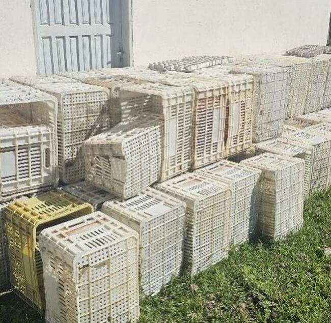 Observação: 80) Lote com aproximadamente 110 caixas plásticas empilháveis, de estrutura vazada, utilizadas para transporte ou armazenamento de insumos. Apresentam sinais de desgaste, coloração alterada e exposição ao tempo;