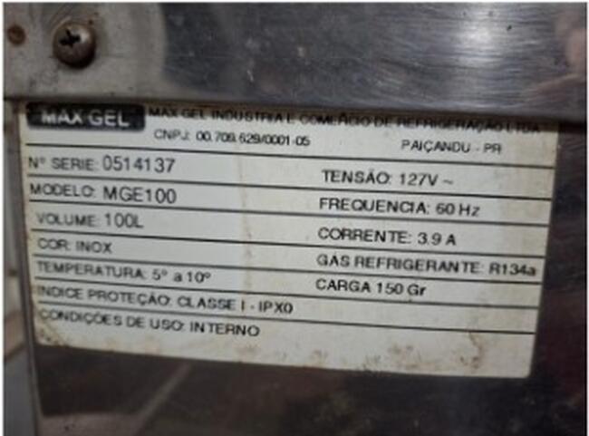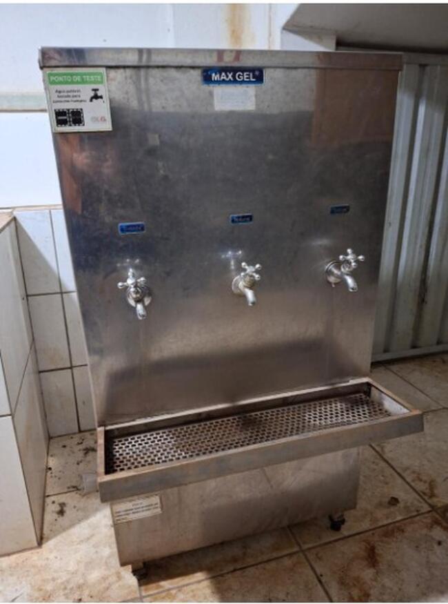 Observação: - 01 bebedouro industrial de coluna, 100 litros, 3 torneiras, de inox, da marca MAXGEL, usado, em razoável estado de conservação e em funcionamento.